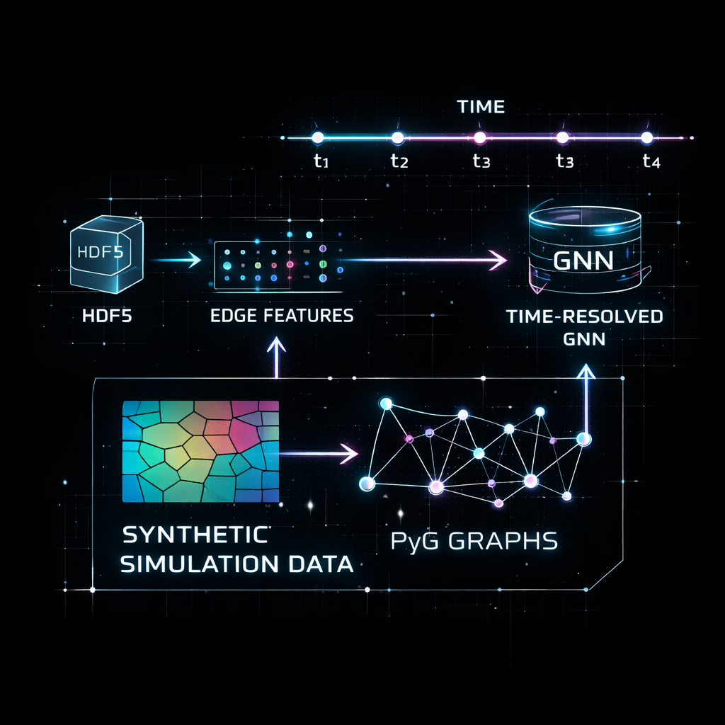 This repository focuses on grain-scale materials modelling using graph representations, where grains are connected by neighbourhood links to predict responses across strain increments in both representative volume elements and experimental datasets. It describes workflows that construct graph data from grain connectivity, normalise physical attributes (shear, orientation, size, phase), and train and evaluate models for strain-path or single-step prediction tasks. It also includes supporting datasets, precomputed edge features, and results for multiple loading scenarios to study how microstructural interactions influence predicted grain responses under deformation.