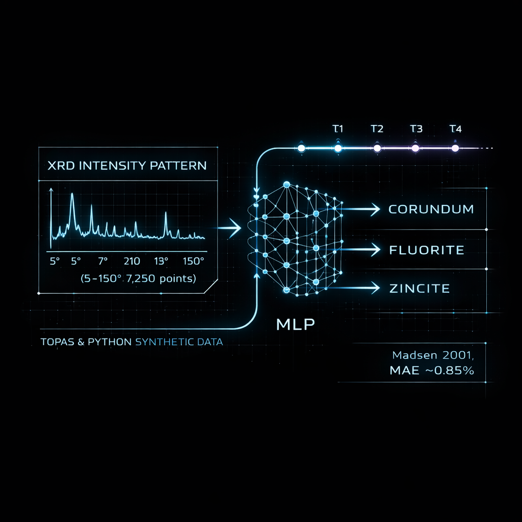 This repository documents a machine-learning workflow that predicts quantitative phase fractions from X-ray diffraction patterns, using 7,250-point intensity inputs spanning 5-150 degrees 2θ to output three phase weight fractions (Corundum, Fluorite, Zincite). It benchmarks performance against the Madsen 2001 round-robin expert dataset and reports a best mean absolute error of around 0.85% on those samples. It also outlines a synthetic data generation approach (TOPAS-based, with a recommended Python simulation alternative) and highlights limitations such as three-phase specialisation and a lack of uncertainty quantification.