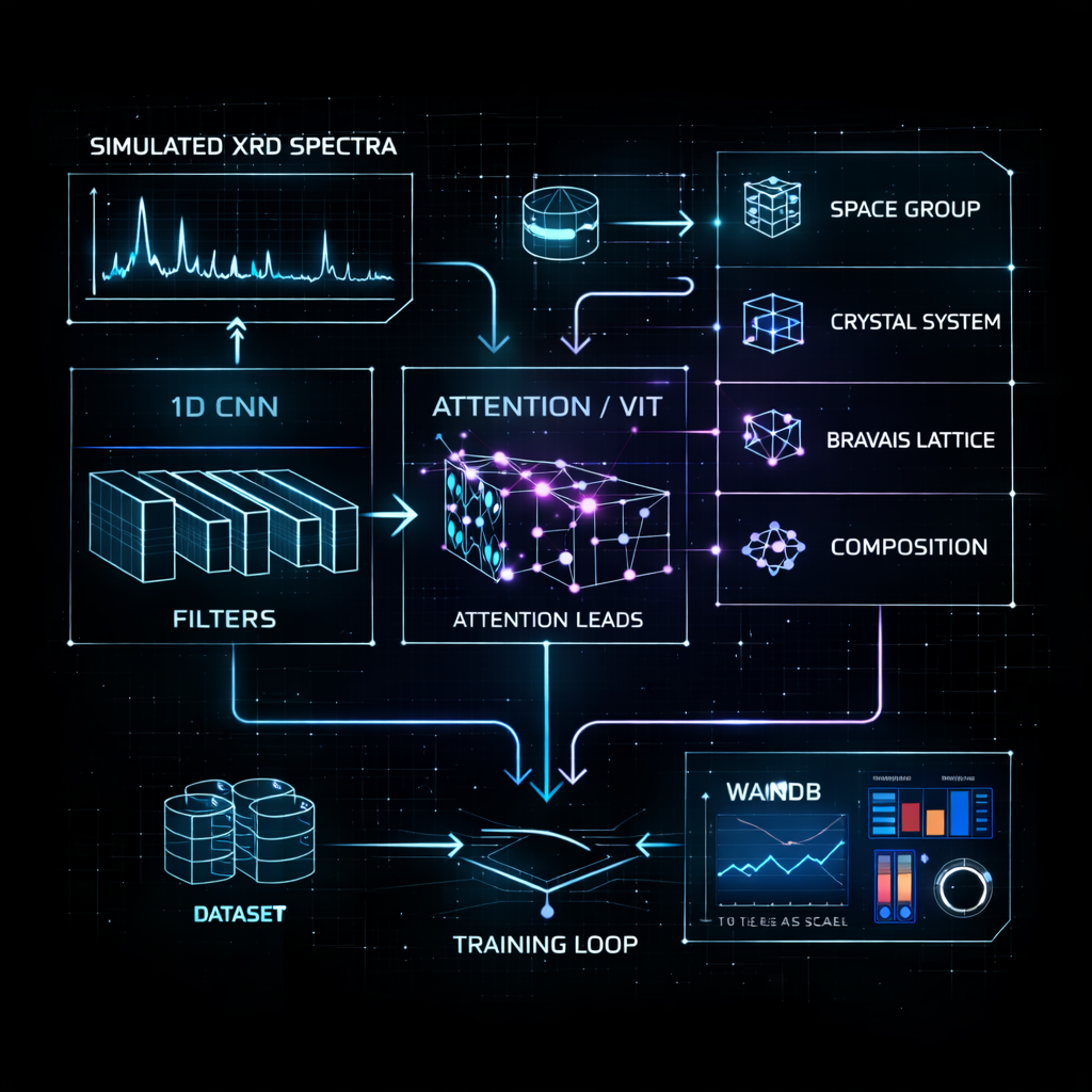 This project focuses on predicting crystallographic properties from simulated X-ray diffraction spectra using a deep-learning workflow that spans data preparation, model training, and evaluation. It supports both single-task and multi-task learning to infer structural labels and composition-level outputs, while providing experiment tracking and analysis artefacts. The repository also documents dataset organisation and provides guidance for running training locally or on HPC environments with reproducibility in mind.